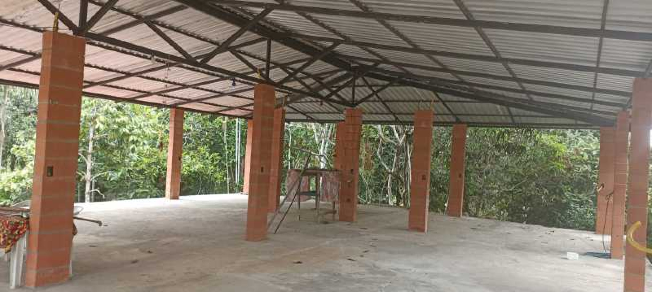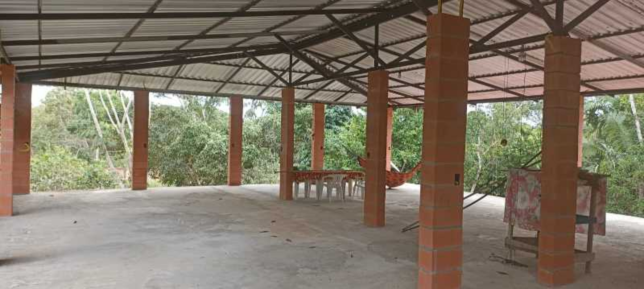 -COMPOSTO POR UM AMPLO SALAO COM 22 COLUNAS DE BLOCO ESTRUTURAL DE 27X19CM, COM COBERTURA COMPOSTA DE PERFIS DE 3 A 5 POLEGADAS COM TELHAS GALVALON DE 0,43MM