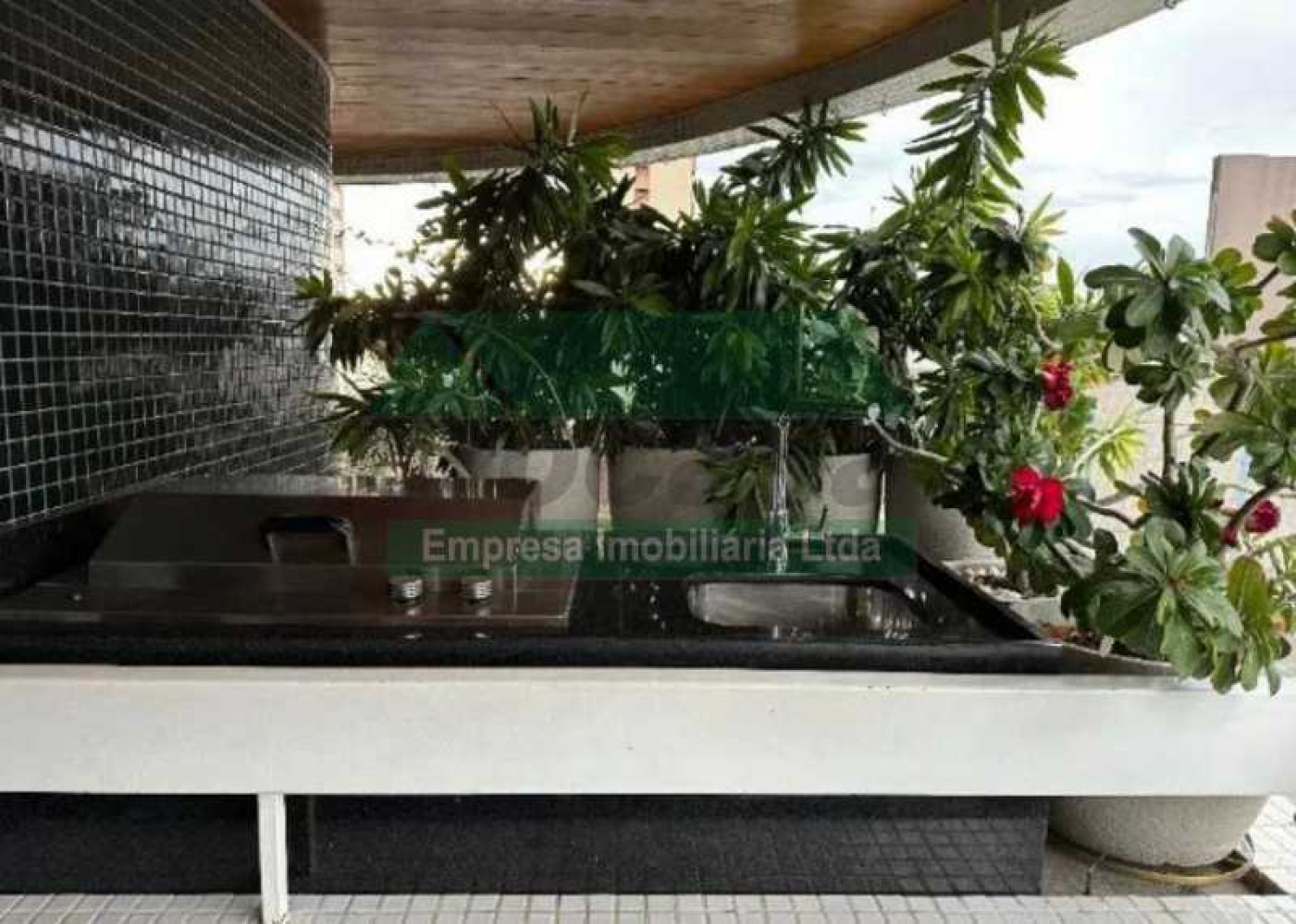 Cozinha: Cooktop + coifa, microondas e forno embutidos, mesa para 6 lugares, televisão, pia com Cuba dupla e água quente.